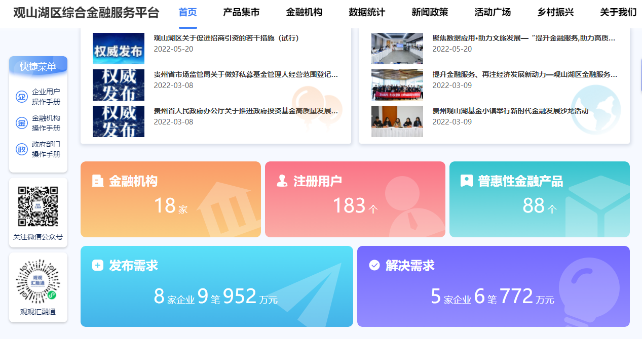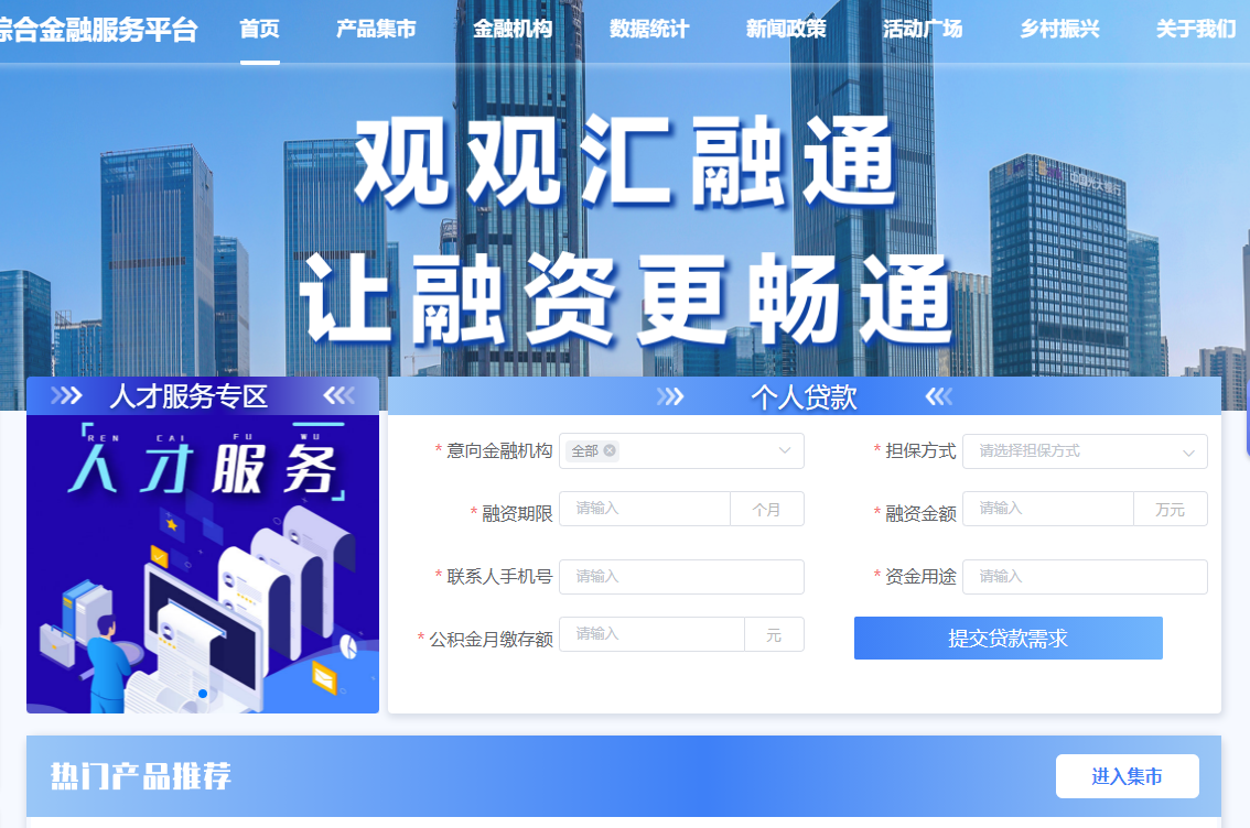 “觀觀匯融通”是由觀山湖現(xiàn)代服務(wù)產(chǎn)業(yè)試驗區(qū)下屬單位,金融服務(wù)中心牽頭搭建的為服務(wù)中小微企業(yè)、人才提供金融服務(wù)的智能撮合平臺。平臺旨在打通政金企間的信息壁壘,提升信用融資比例,解決傳統(tǒng)融資所遇到的銀行獲客成本高、融資風(fēng)險高、企業(yè)信息不對稱、融資渠道少且難的問題,提高融資對接精準(zhǔn)度和融資撮合的成功率,促進(jìn)行業(yè)的良性發(fā)展。