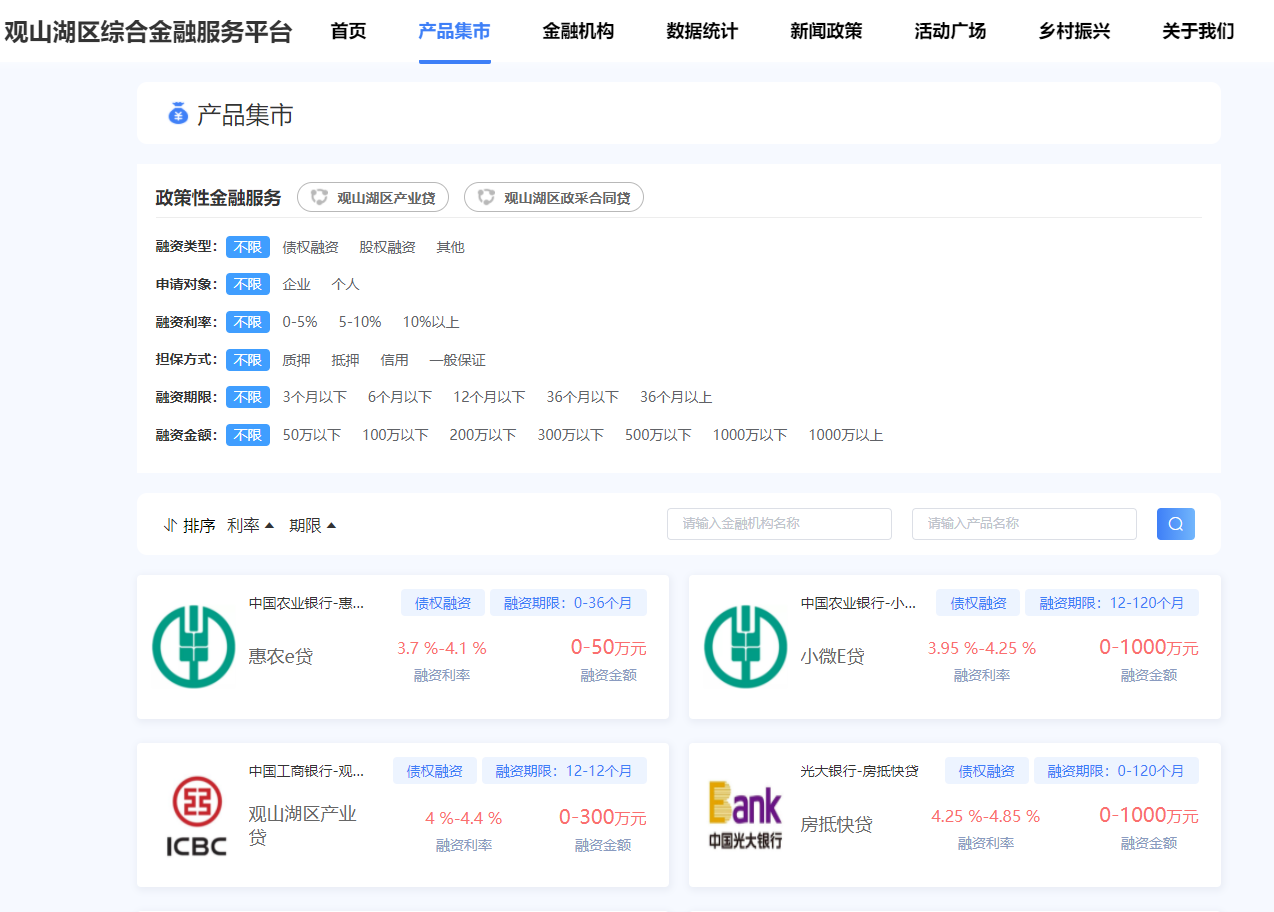 集中展示各家銀行機(jī)構(gòu)的金融產(chǎn)品,同時展示政策性產(chǎn)品,對每個貸款產(chǎn)品展示包括產(chǎn)品名稱、產(chǎn)品介紹(金額、期限、利率等)、準(zhǔn)入條件等。