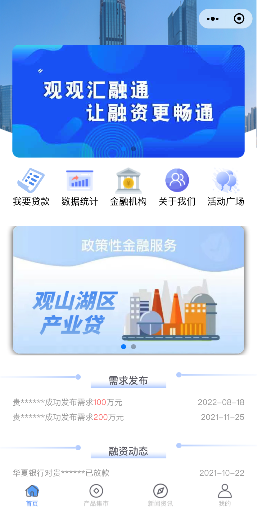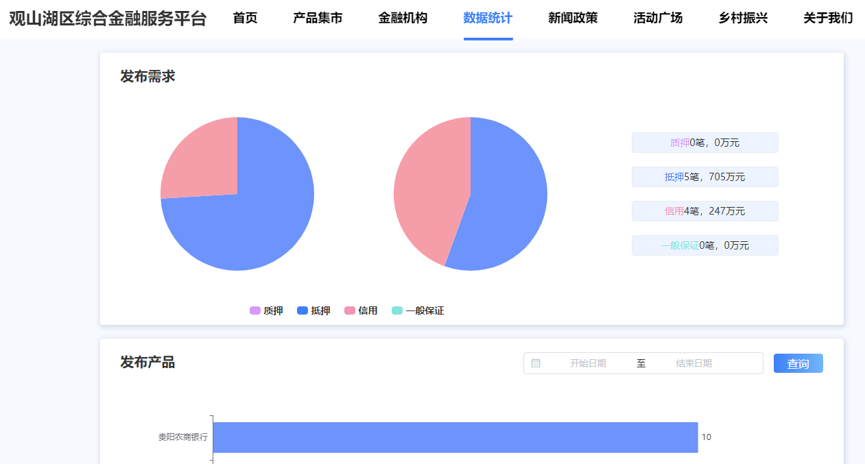 首頁是對外展示的第一入口,通過選擇融資金額、融資期限、擔(dān)保方式等維度快速智能匹配合適的產(chǎn)品,達(dá)到快速融資目的,還將進(jìn)行成果展示,包括入駐金融機(jī)構(gòu)數(shù)、金融服務(wù)顧問數(shù)、金融產(chǎn)品數(shù)、發(fā)布需求數(shù)以及解決需求數(shù)。